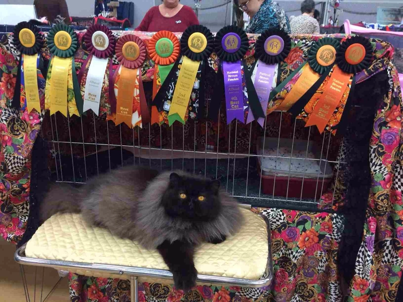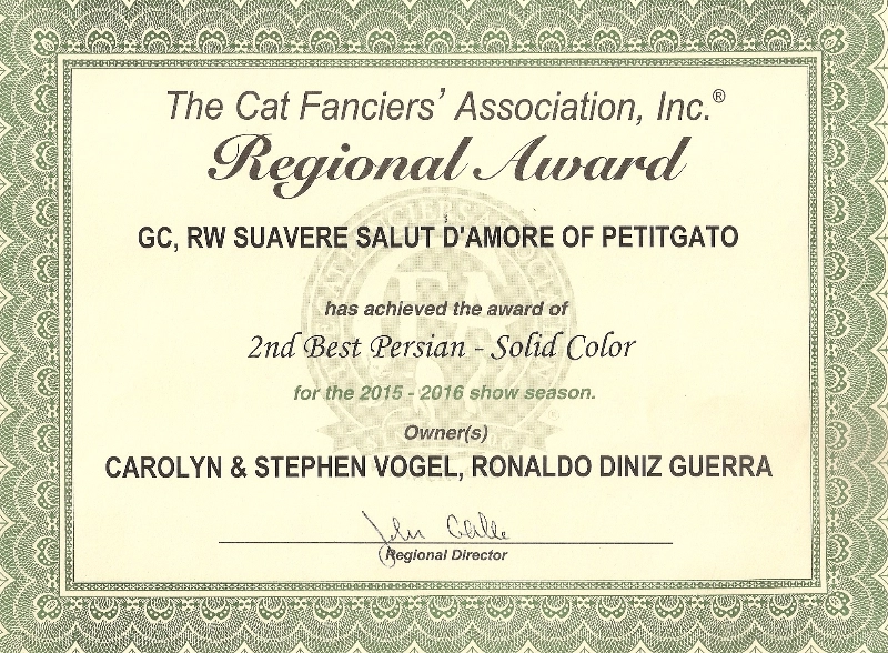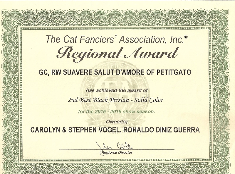 We have introduced a new Persian black male GC, RW Suavere’s Salut d’Amore of Petitgato in my breeding program. Our thanks to Carolyn & Stephen Vogel of Suavere Persians for trusting us with this loving and beautiful cat. He was shown just 4 months of the show season, until November 2015, and in that short time earned the points to become a Regional Winner.
